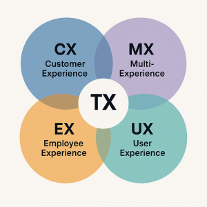 Figura 1: Representación de los cuatro componentes principales de la estrategia de Experiencia Total (TX): experiencia del cliente (CX), experiencia del empleado (EX), experiencia de usuario (UX) y multi-experiencia (MX). Un enfoque TX reconoce la interconexión de todas estas dimensiones para optimizar los resultados del negocio.